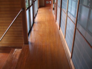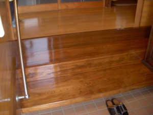 長年お付き合いをさせていただいているA様から「廊下の床が沈んでブカブカしている」「玄関式台が汚い」と相談されました。 フローリング貼りと玄関式台の塗装を行うことになりました。 |