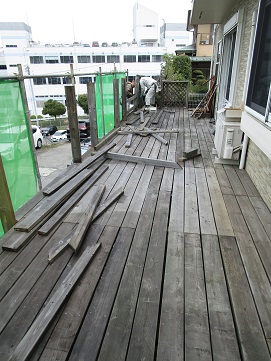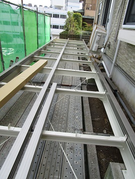 工事期間 | 12日間 | 工事費用 | 足場工事約12万円 解体工事約10万円 鉄骨工事約24万円 ウッドデッキ 145万円 |